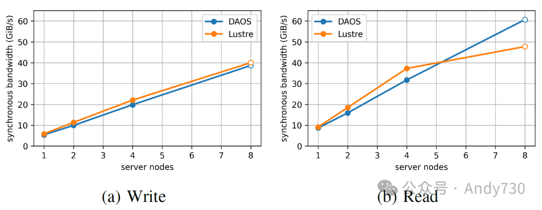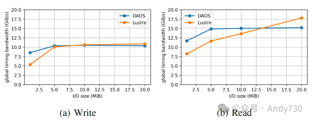 图1:应用IOR分段模式的访问模式A,显示了Lustre和DAOS的平均同步写入和读取带宽结果。