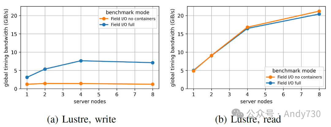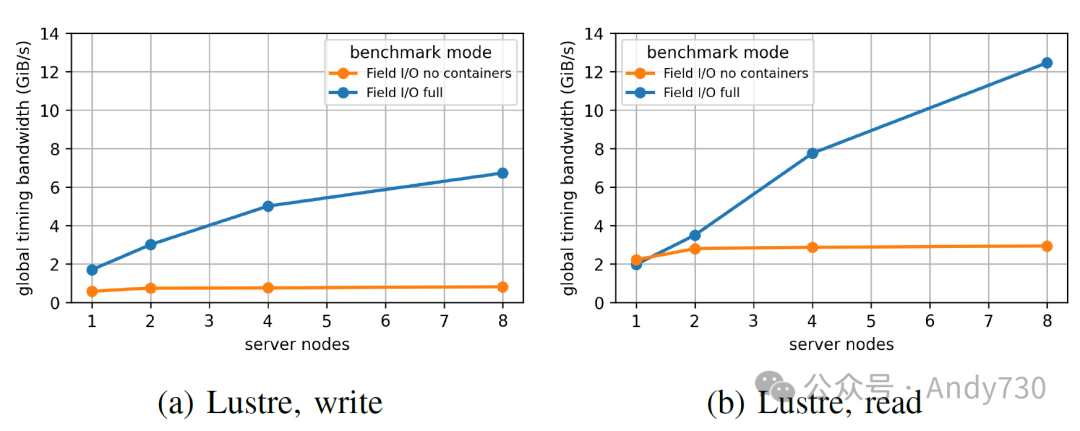 就实现的综合应用带宽而言,Lustre在Field I/O模式B的完整模式中可达到约20 GiB/s,达到8个服务器节点,接近模式A中获得的读取带宽,但远低于DAOS在模式B中的任何模式中获得的更高的综合带宽。