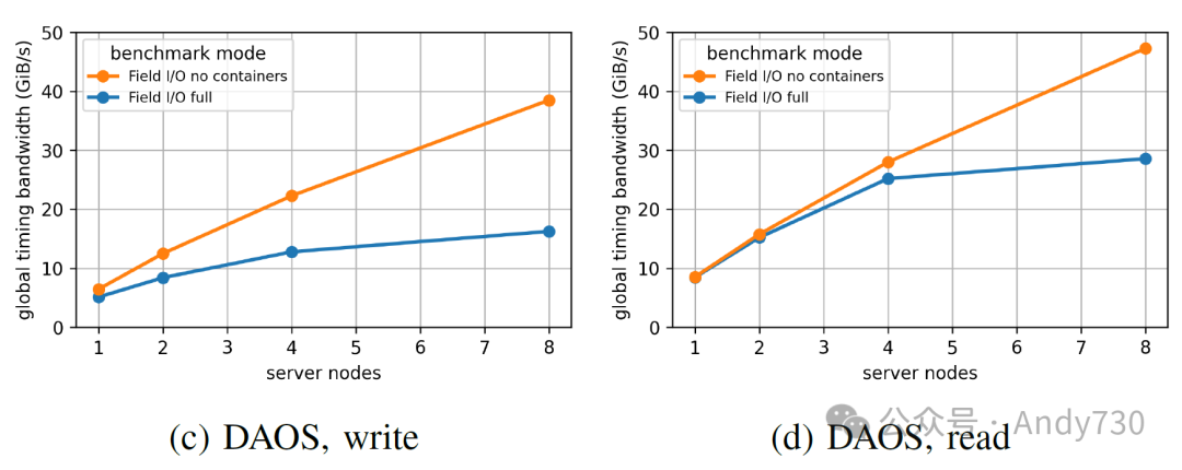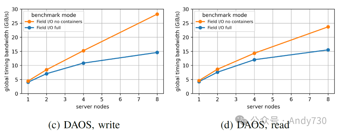在最近的一项研究中,作为验证先前研究的工作,我们评估了DAOS,这是一种备受关注的高性能对象存储。通过模拟NWP应用场景中的I/O模式,我们使用与存储级内存(SCM)相结合的专用基准测试,评估了DAOS在这些操作中的性能[3]。