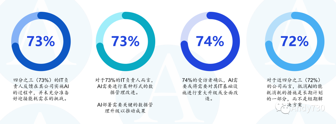 对于IT负责人而言,挑战不仅在于构建持久的AI架构,还在于以符合其ESG(环境、社会、治理)优先目标的方式拥抱AI。为了帮助准确定位AI导入过程中与企业可持续发展目标相平行的障碍,我们在美国、英国、法国和德国等四个主要全球市场对500名以上员工的公司进行了调查。调查发现,对于88%已经实施AI的公司,对计算能力的需求急剧增长。实际上,近一半(47%)的公司自实施AI以来不得不将其计算能力提高一倍或更多。此外,近四分之三(73%)的IT负责人反馈,在其公司实施AI的过程中,并未充分准备好应对能耗需求的挑战。
