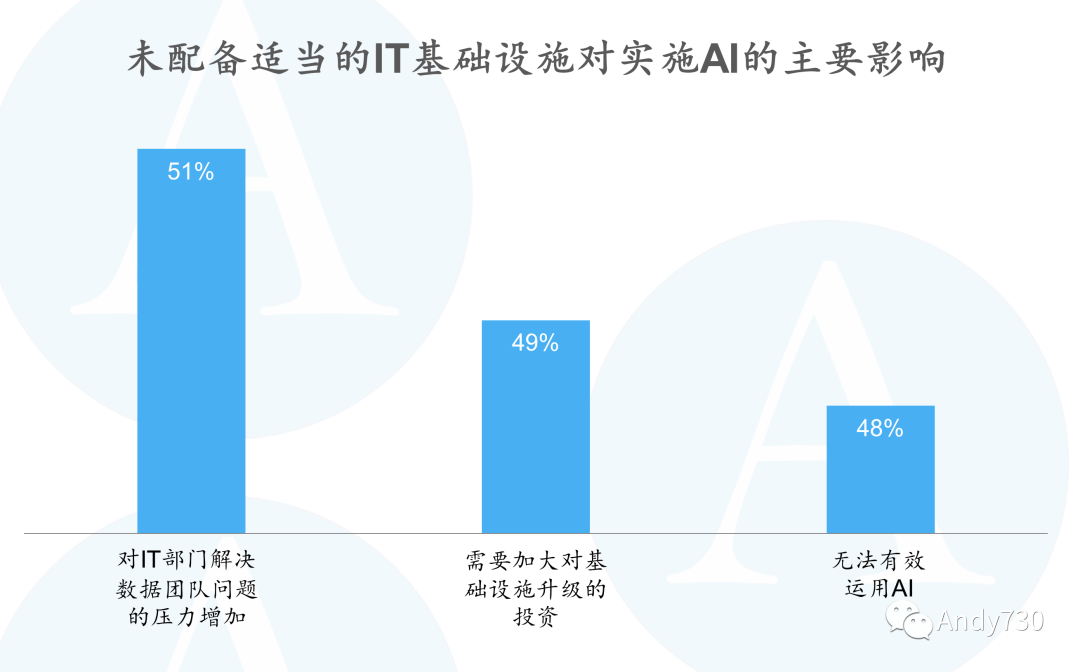 在没有适当的IT基础设施的情况下部署AI的主要后果,包括对IT部门增加解决数据团队问题的压力(51%)、需要更多投资来升级基础设施(49%)以及无法有效使用AI(48%)。