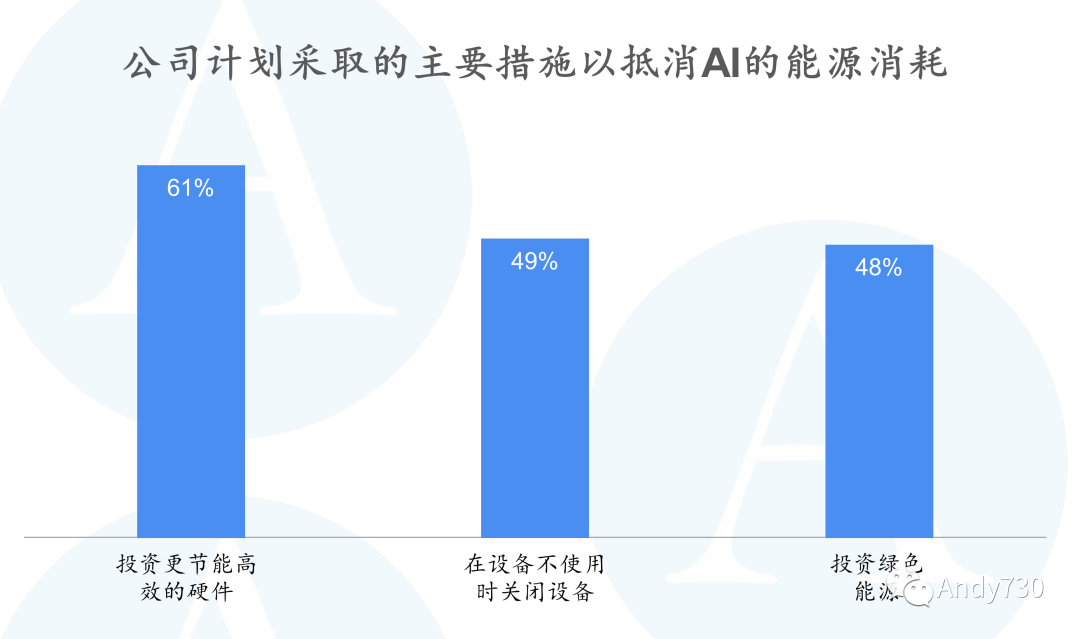 根据调查,89%的受访者在部署AI后升级IT基础设施时面临了实现ESG目标的困难。为了应对这一挑战,已经部署了AI技术或计划在未来12个月内部署的60%的人表示,他们投资了或将投资更节能高效的硬件,以实现ESG目标。