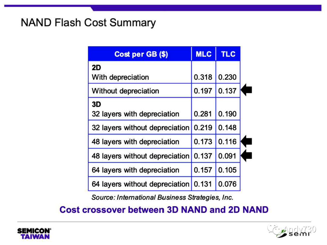 还要注意,Handel演示文稿中有两列,分别表示MLC(每单元2位)和TLC(每单元3位)。这有助于指示不同世代闪存之间的成本差异。计算SLC和TLC的方法是使用业内公认的位数来计算它们。例如,MLC有2位,而SLC有1位,因此我们可以简单地将MLC价格乘以2。