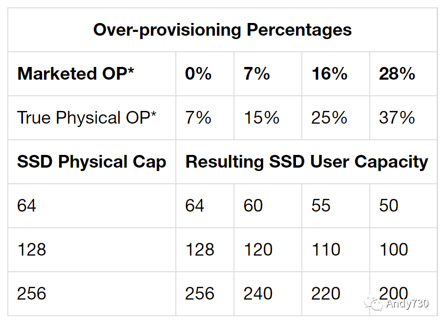 预留空间是为了提供更高的WPD(Write Per Day,也即更高耐久度的SSD),或者用于提供更快的写入速度(因为将某些闪存视为SLC)而保留的NAND。尽管不能将NAND闪存用于存储文件,但仍然必须考虑这些成本。可以找到不同容量点的示例预留空间水平。通常,可以通过查看驱动器的容量来判断是否已进行预留空间。由于内存/闪存是基于2的幂次方的,这意味着自然的容量点将是 128、256、512GB、1024GB、2048GB等。但是,如果看到一个容量为100GB、120GB的SSD,那么这可能意味着正在使用预留空间。可以查看下面的记录来源,这些来源突出了所有SSD供应商使用的热门预留空间水平。