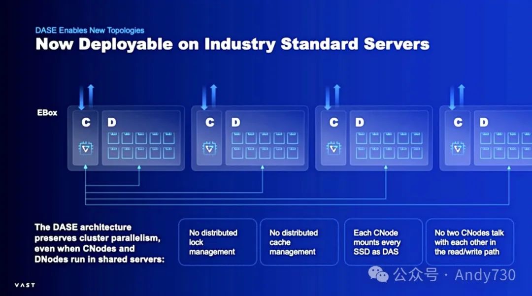 “尽管从外观上看,这种解决方案可能与市场上的许多其他软件定义存储方案相似,但重要的是要了解,DASE软件架构仍然保持完整,以确保真正的集群范围数据和性能并行性(即无需分布式锁定或缓存管理,每个CNode容器仍然挂载每个SSD以显示为本地磁盘,CNode容器在读写数据路径上从不相互通信)。”