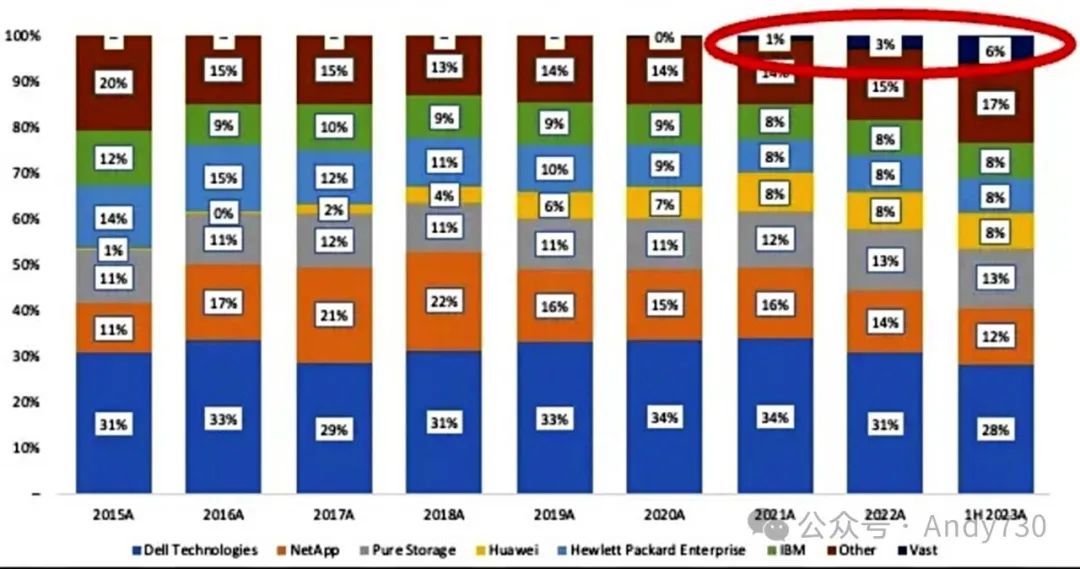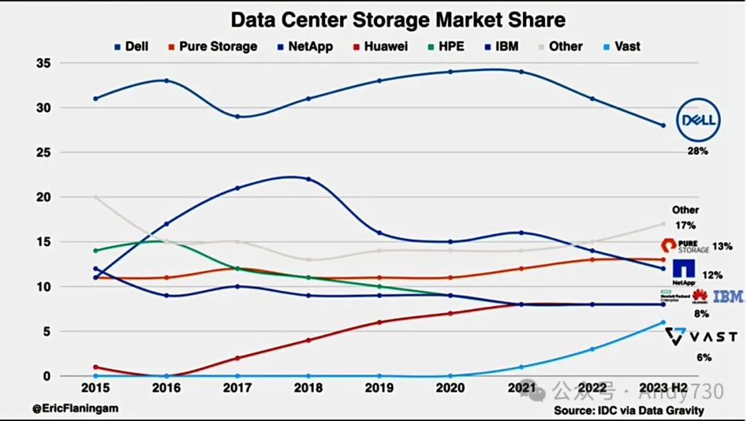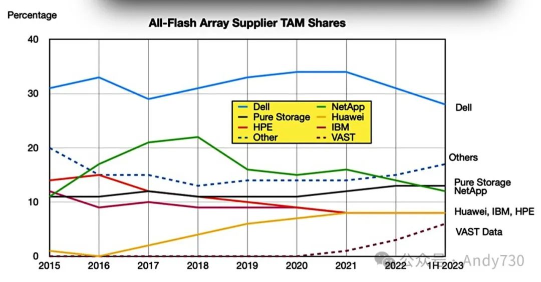 《数据引力》是Wing Venture Capital合伙人Chris Zeoli制作的一份订阅型通讯。在2023年12月版中,他引用了一份IDC图表,该图表展示了从2015年至2023年上半年,Dell、HPE、Huawei、IBM、NetApp、Pure和VAST等公司在全闪存总市场规模(TAM)中的占比。