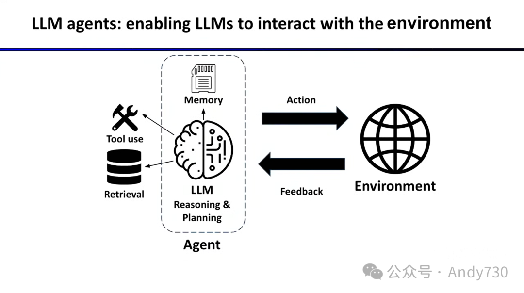 本课程将涉及下一个前沿——大型语言模型代理。我们不仅仅是将文本作为输入并输出文本,而是将大型语言模型作为推理和规划的核心,使代理能够与外部环境互动、观察环境并采取行动。代理将利用外部工具和数据库进行检索,以帮助执行这些任务。