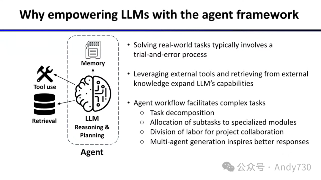 为什么我们的代理是下一个前沿?我们需要为代理赋能代理框架,有几个原因。解决现实世界的任务很少涉及单一文本输入生成文本输出;这通常需要试错过程。利用外部工具和从外部知识中检索可以扩展能力。更重要的是,这种动态代理流动可以通过任务分解、将子任务分配给专业模块以及项目协作的劳动分工,促进解决复杂任务。在整个课程中,我们还将看到多代理生成可以激发更好的响应。
