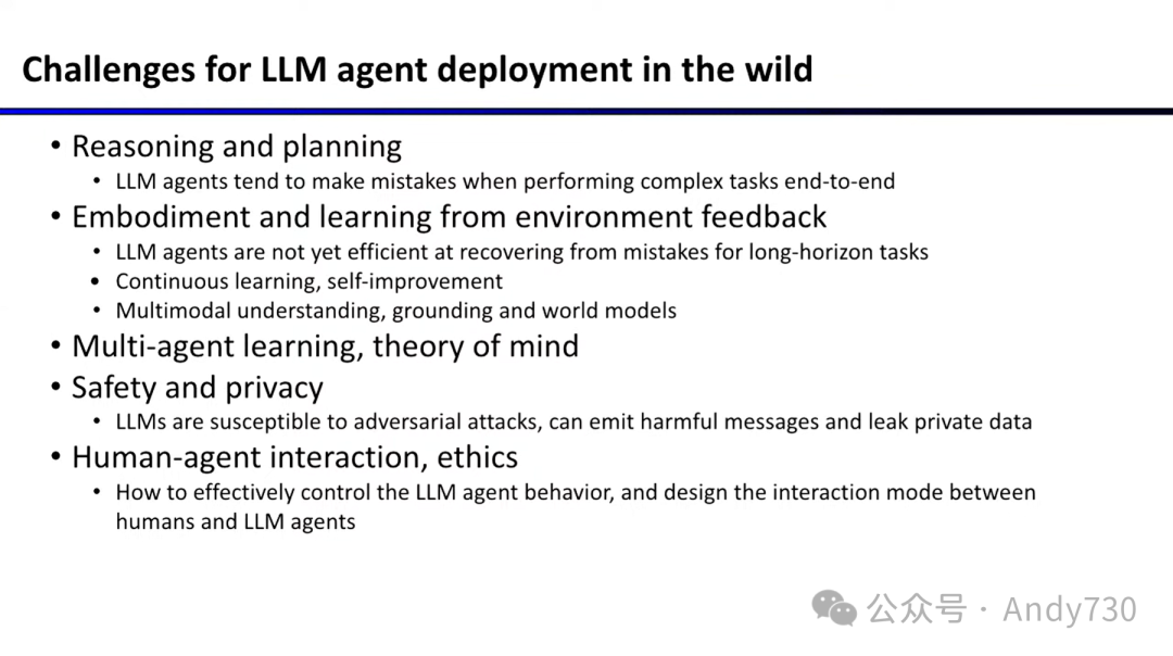 安全和隐私问题至关重要;代理容易受到对抗性攻击,并可能基于私人数据发布有害信息。解决这些挑战对于在现实世界中安全部署代理至关重要。此外,促进人类互动和伦理——有效控制代理行为并设计人机交互模式以最好地服务于人类需求——也是重要的。