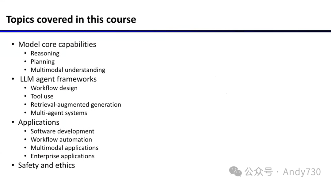 为了帮助学生学习和发展解决这些挑战的方法,课程涵盖了代理框架不同层次和多个领域的广泛主题。我们将讨论关键模型能力,包括推理、规划和多模态理解。我们还将探索流行的现实世界代理框架,使学生学习如何设计代理应用程序和利用各种工作流程。这将帮助学生学习使用我们的代理框架进行工作流程设计、增强生成和多代理系统。
