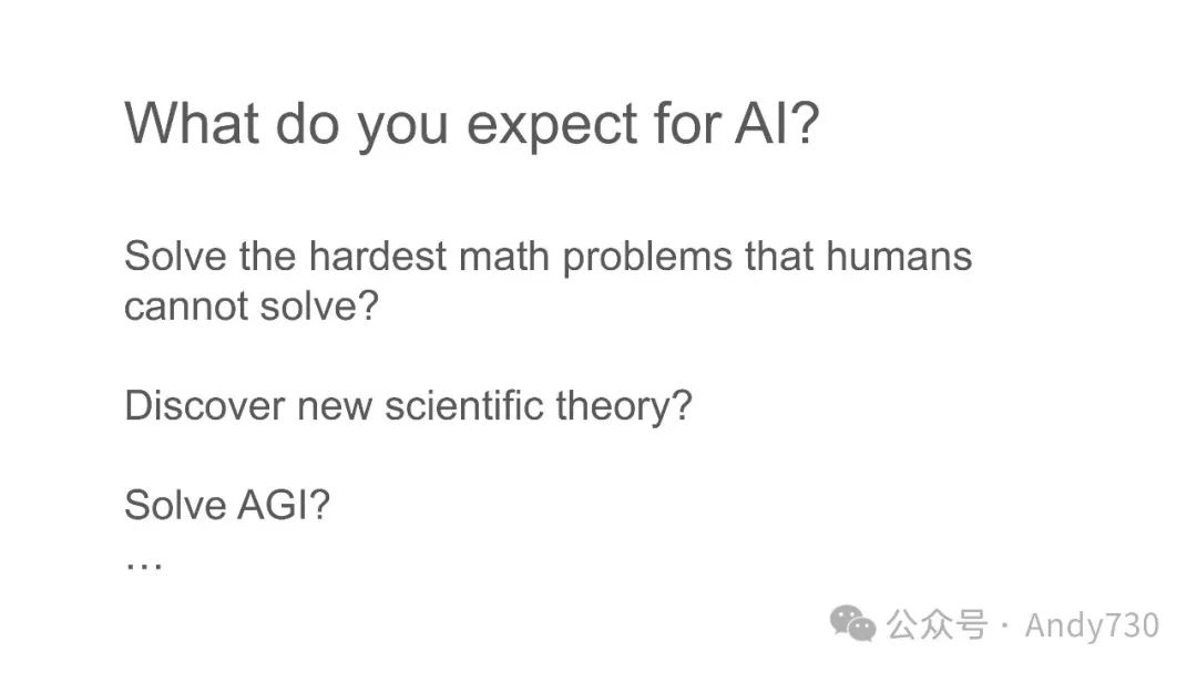 我能想象到许多不同的答案,比如解决人类无法解决的最难数学问题,或者发现新的科学理论,甚至实现通用人工智能。