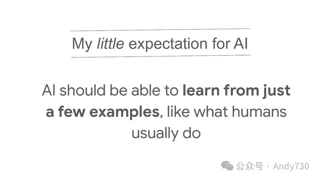 我的背景是机器学习。我不知道这里是否有很多人学习机器学习课程,因为这正是我关注的重点。作为一名机器学习研究者,我对人工智能有一些期望,它应该能够从少量例子中学习,正如人类通常所做的那样。