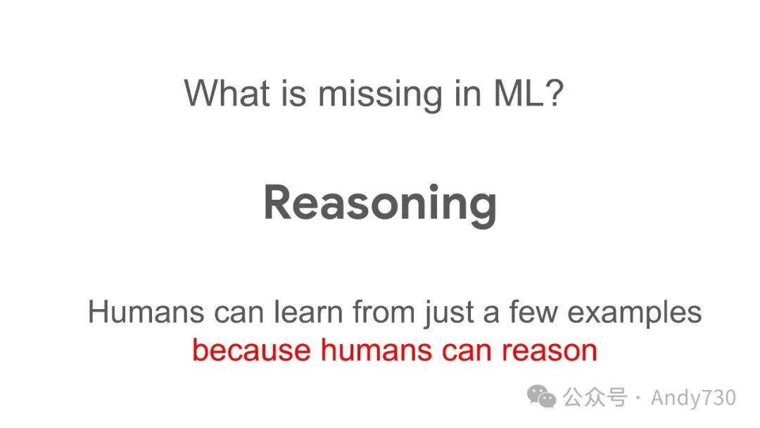 这激励我思考另一个问题:机器学习中缺少什么?经过多年的模型训练,我终于找到了答案:推理(Reasoning)。在今天的背景下,尤其是对于参与课程的人来说,这个想法似乎是显而易见的,对吧?人类能够从少量例子中学习,是因为人类能够推理(Reasoning),而不仅仅是基于数据统计。这听起来非常简单明了。
