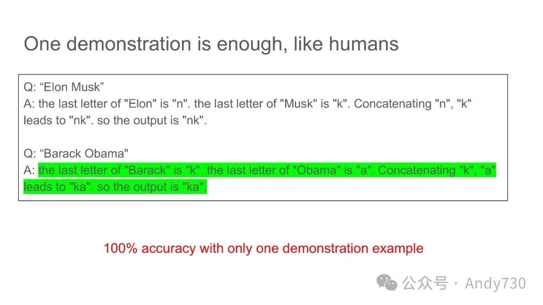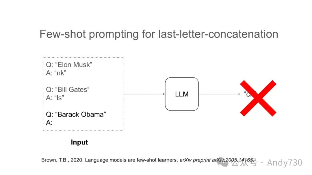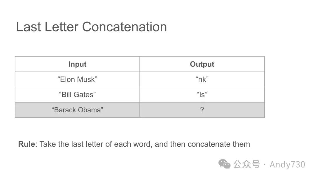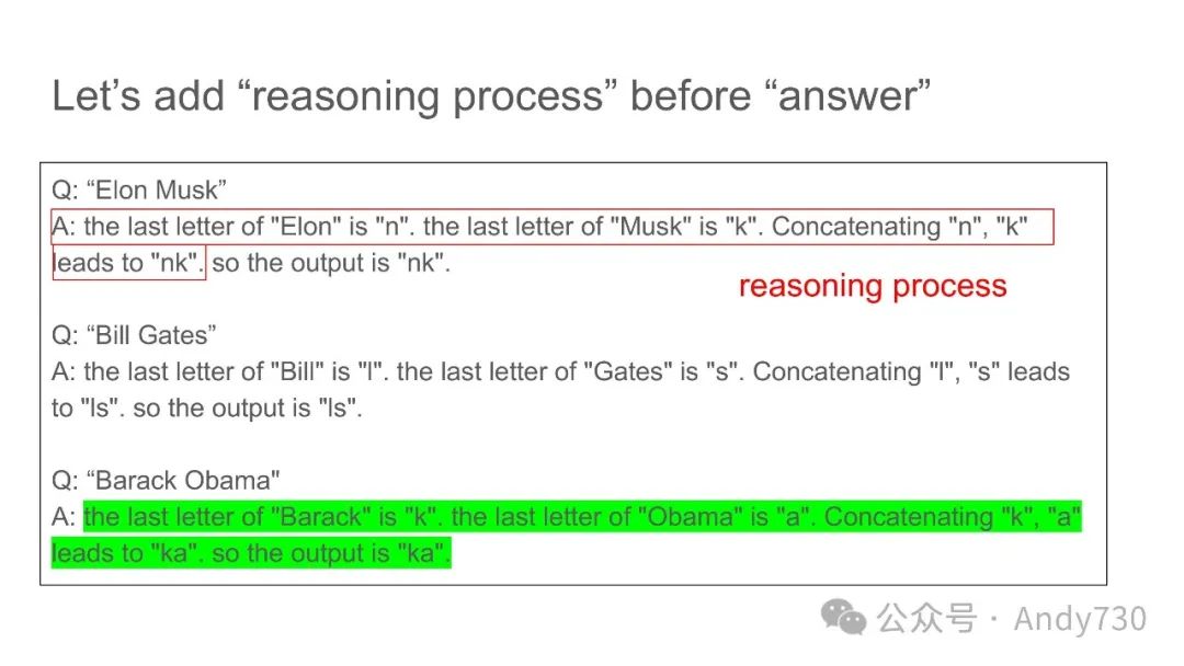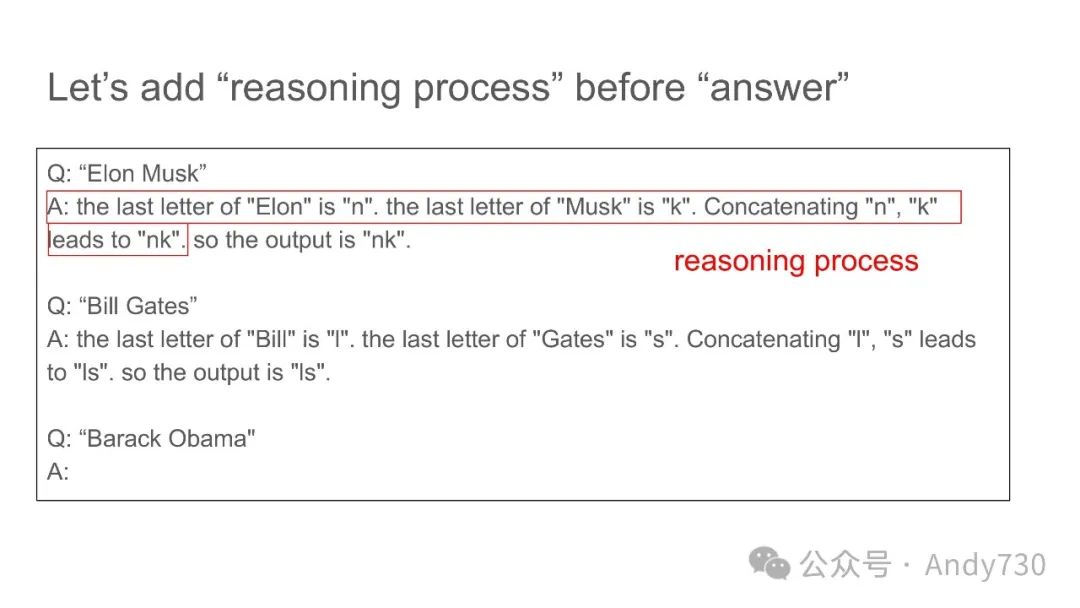 最近,我们知道如何修正这个提示的想法。我们只需在回答之前添加一个推理过程。例如,我们会说:“‘Elon’的最后一个字母是N,‘Musk’的最后一个字母是K,所以连接得到NK。”同样,我们可以应用于“Bill Gates”。