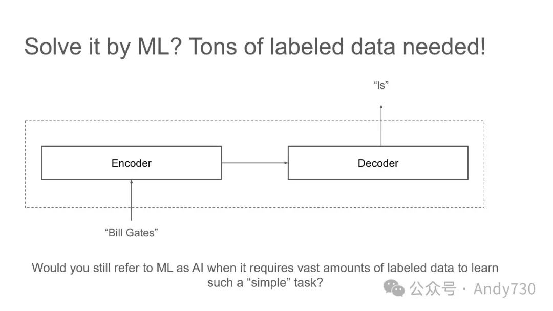 如果几年前你遇到这个问题,可能会尝试使用机器学习模型,比如Transformer模型。一部分作为编码器,另一部分作为解码器。你会发现需要大量带标签的示例来训练模型。最终,你可能会达到大约85%或90%的准确率。