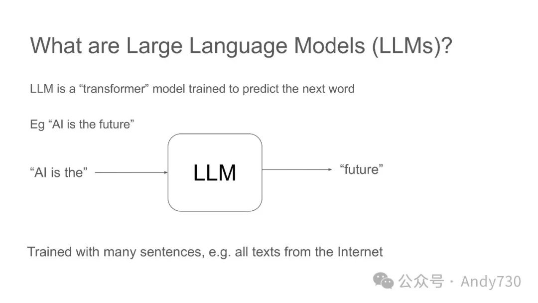 我假设大多数人对大型语言模型有所了解,但教授会解释LLM是什么。大型语言模型是经过训练以预测下一个词的Transformer模型。例如,给定文本“AI是未来”,模型学习预测下一个可能的词。如果预测的词不是“未来”,我们需要通过反向传播调整参数。你可以使用许多句子分享你的模型,比如使用互联网上的所有文本。