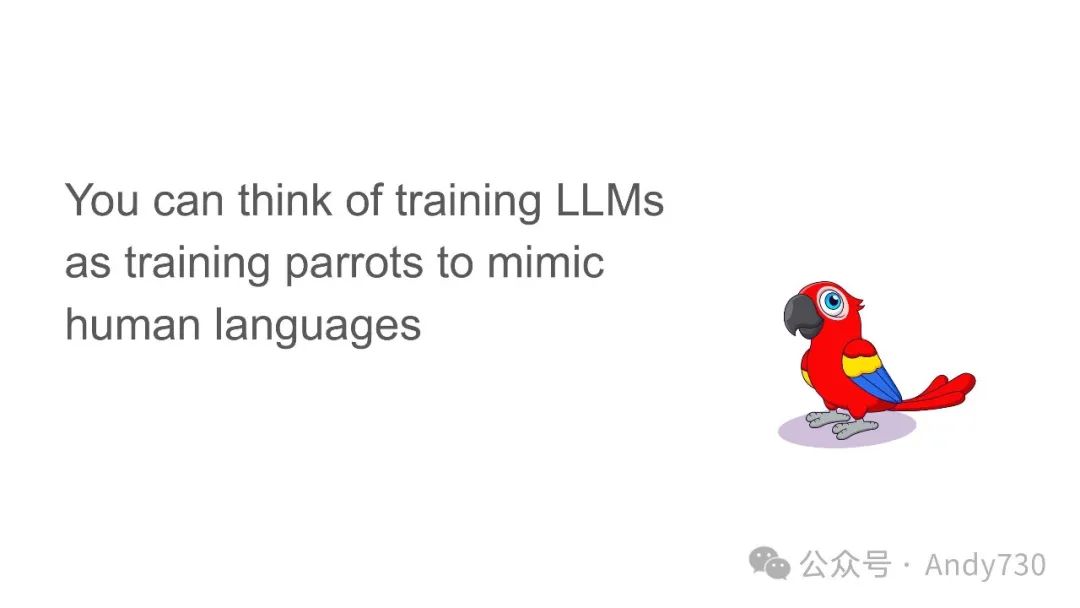 如果想简化一下,可以把训练大型语言模型看作是训练鹦鹉模仿人类语言。我实际上在推特上提到过这个,有人回应表示对训练鹦鹉感到好奇,因为那是他的工作。
