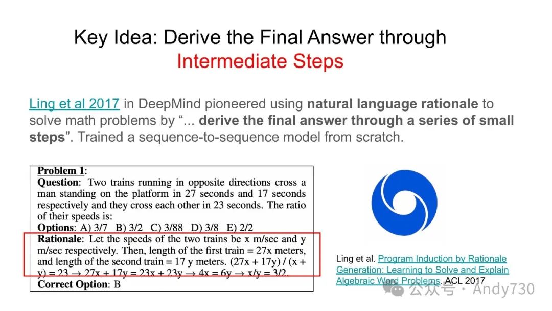 多年前,文献中就提出了添加中间步骤的想法。例如,谷歌DeepMind的研究人员在2017年ACL会议上发表了一篇出色的论文。在他们的论文中,他们使用自然语言推理来解决数学问题。他们写道:“通过一系列小步骤推导最终答案。”随后,他们从零开始训练了一个序列模型。如果你了解通道的工作原理,就会发现这篇论文的惊人之处。他们还提出了时间旅行者的概念,知道如何采取不同的方法。