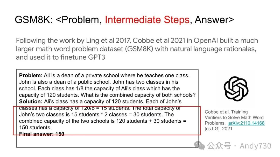 2021年,OpenAI团队发布了一个名为GSM8K的出色数据集,他们沿用了DeepMind在2017年提出的思路。在这个数据集中,每个问题都附有中间步骤作为解决方案,以及最终答案。该团队创建了一个令人印象深刻的数据集,并用它来微调GPT-3模型,显著提升了2017年谷歌DeepMind的工作。