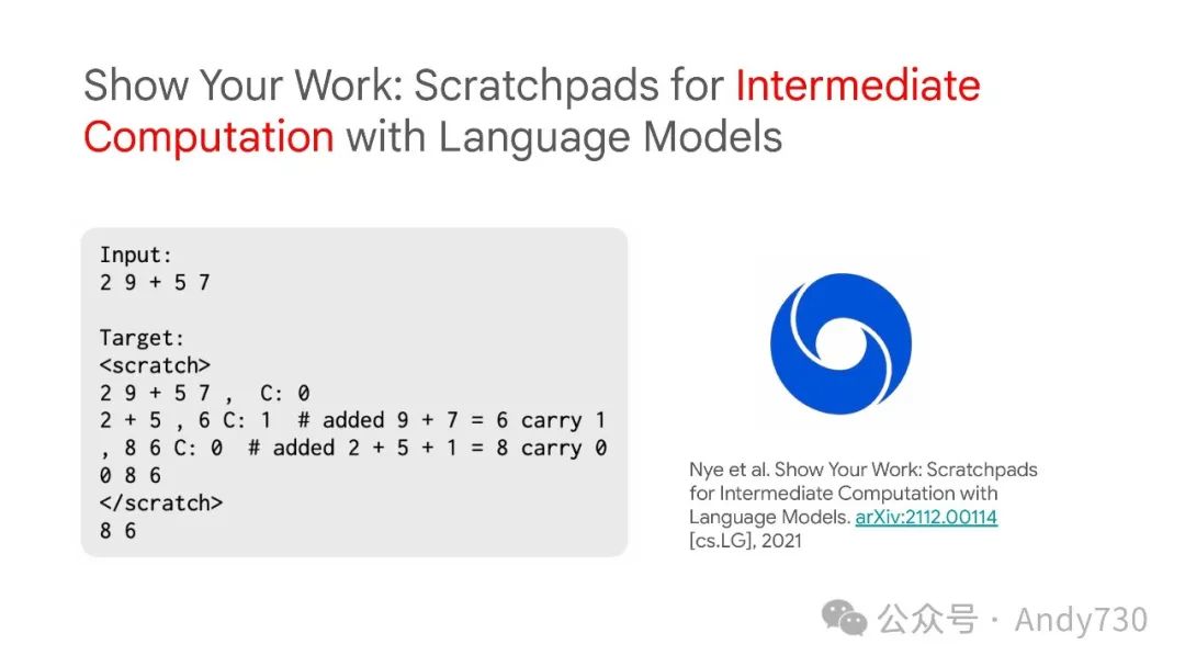 同年,谷歌Brain(现为谷歌DeepMind的一部分)的研究团队发布了关于使用语言模型进行中间计算的草稿板的研究。他们在程序合成领域独立发现了类似的想法,因此使用了抽象符号而非自然语言。
