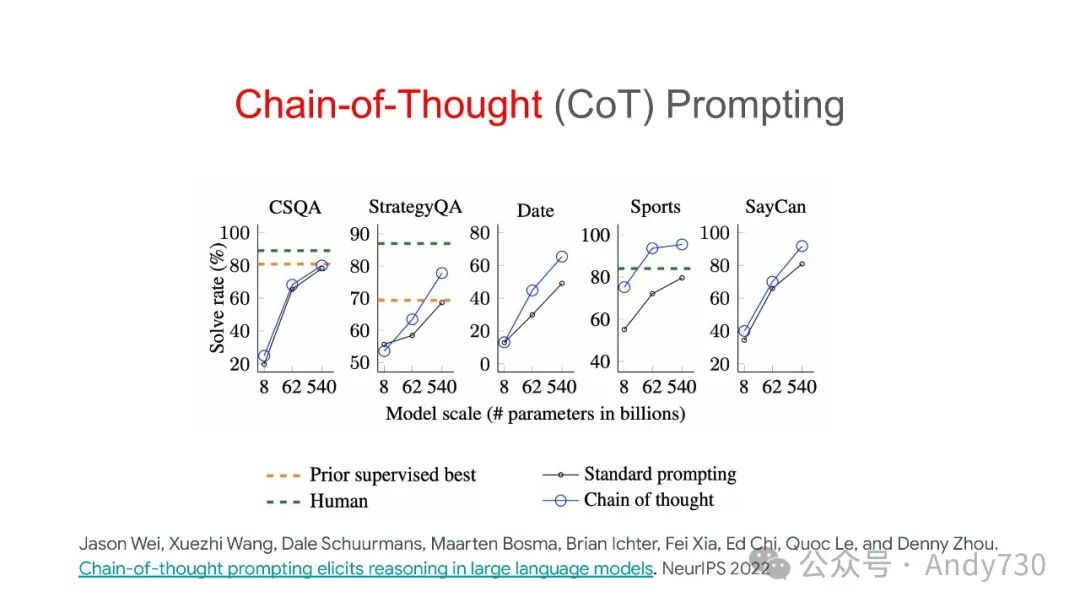 许多人可能熟悉我们在链式思维提示方面的工作。“链式思维”(Chain-of-Thought,CoT)这个术语并不是我们发明的,而是一个常见的英语短语,意味着多步骤推理。在这项工作中,我们对包含中间步骤的提示进行了广泛评估,几乎在所有自然语言处理任务上都展示了惊人的结果。