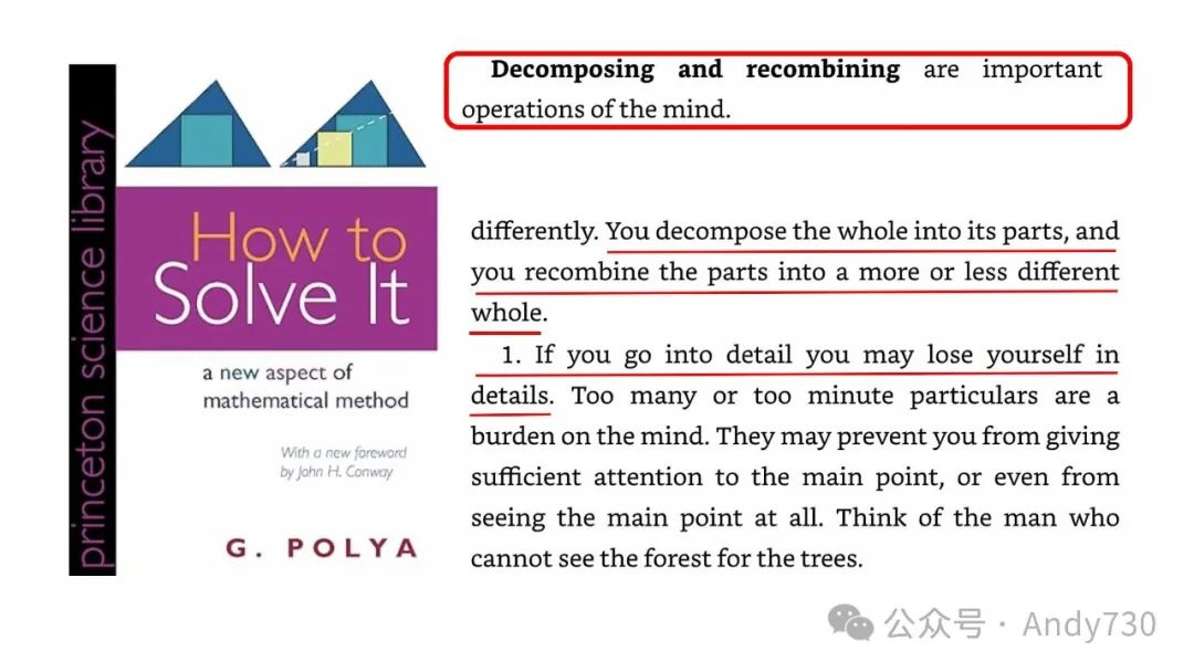 许多人可能熟悉Polya的著作《如何解题》,这是数学教育的经典之作。其中有一章讲述分解。如果深入到细节中,可能会失去大局观。现在,让我们看看分解所带来的不同。