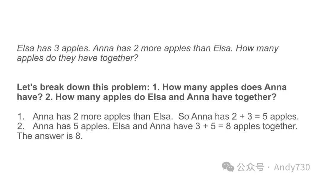 考虑这个数学问题:“Elsa有3个苹果,Anna比Elsa多2个苹果。他们一共有多少个苹果?”关键在于我们首先建模如何拆分这个问题,然后逐一解决较小的部分。这就是为什么我将这两种模型称为处理由易到难的复杂问题。
