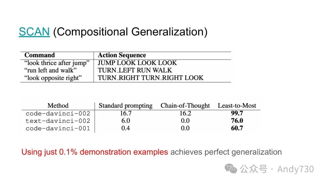这是一个简单的想法,但出人意料地有效。人类知道如何将复杂任务分解为更简单的任务。这是一个关于组合泛化的SCAN任务。给定自然语言命令,我们需要将其翻译成机器人可以执行的动作序列。通过使用由易到难的提示,我们仅用0.1%的演示示例就达到了99.7%的准确率。