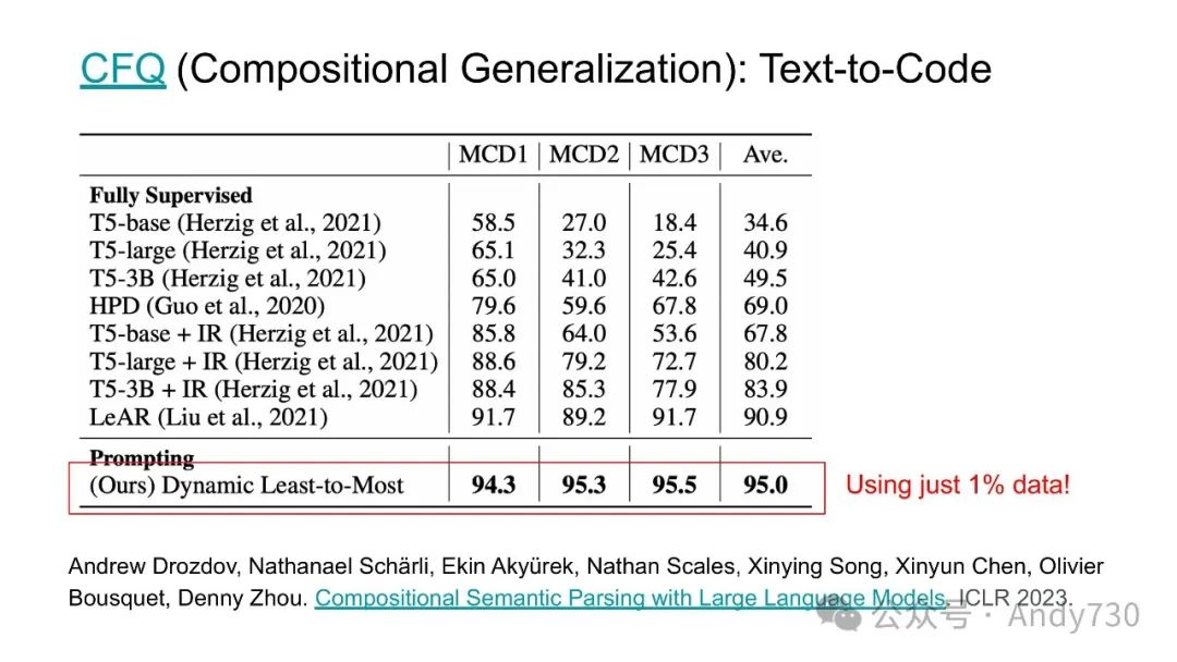 另一个名为CFQ的任务,文本转代码,也涉及组合泛化。我不知道这里是否有人了解组合泛化的概念。大致而言,任务示例比训练示例或提示示例更复杂。对于文本转代码的问题,任务要求更长的代码片段。在这里,我们的操作稍微改变为动态由易到难的提示,并且在使用仅1%的数据时取得了良好的效果,远超文献中的结果。