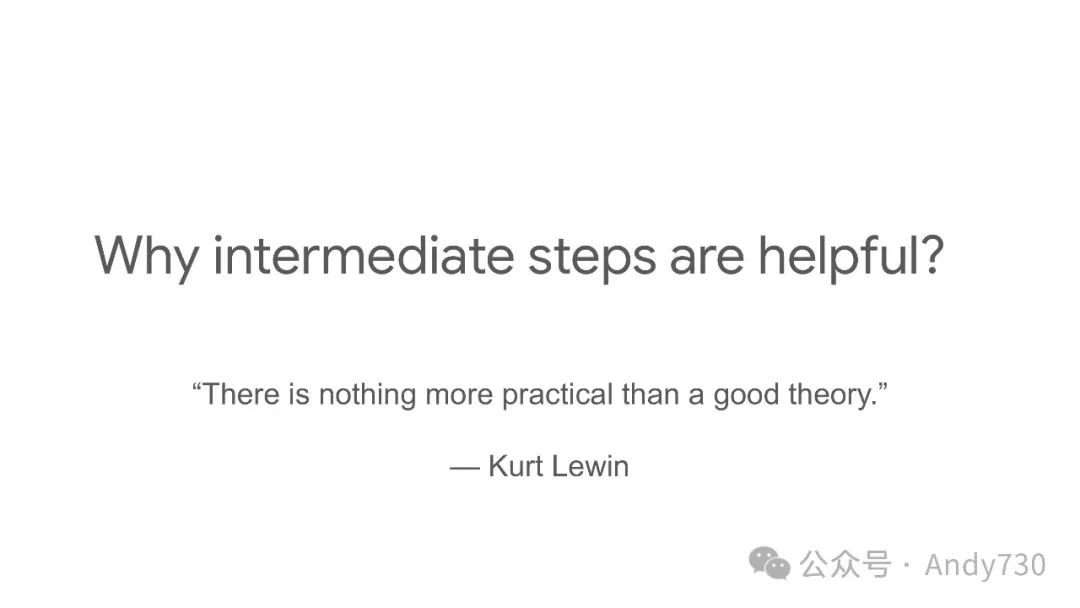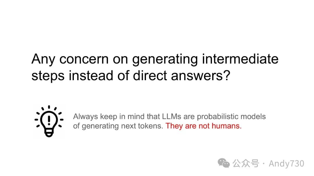 现在,可能有人会问,为什么中间步骤是有帮助的。虽然这对人类来说似乎很自然,但我们在研究中需要更深入地思考。我们的大型语言模型仍然只是机器学习模型。它们为什么不理解?到底发生了什么?
