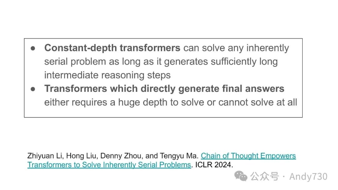 我们与斯坦福大学的优秀科学家合作,在ICLR 2024上发表了研究。在这项工作中,我们进行了严格的数学分析。关键结果是:只要深度超过一个常数阈值(与输入无关),生成中间步骤的Transformer模型可以解决任何固有的串行问题。然而,如果模型直接生成答案,则要么需要巨大的深度来解决,要么根本无法解决该问题。