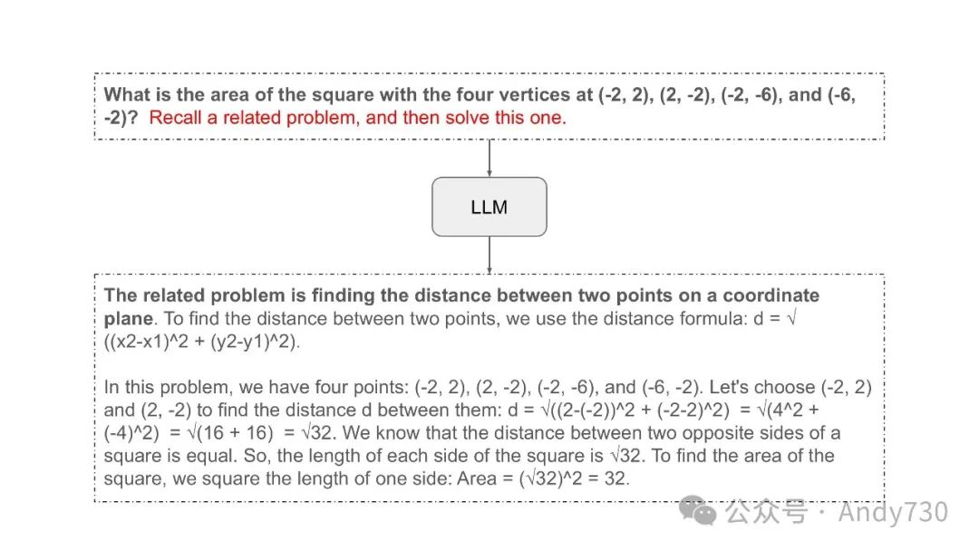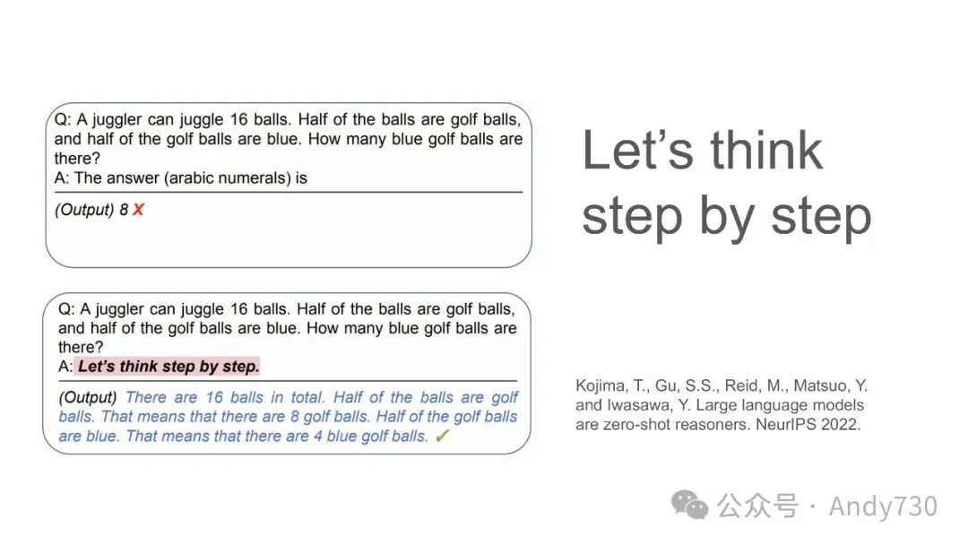 这里有一项令人惊叹的工作。当论文“让我们逐步思考”发布时,我最初以为这是个玩笑,但结果却非常启发人。给定一个问题,我们不需要任何示例;只需要说“让我们逐步思考”,模型就能生成推理步骤。