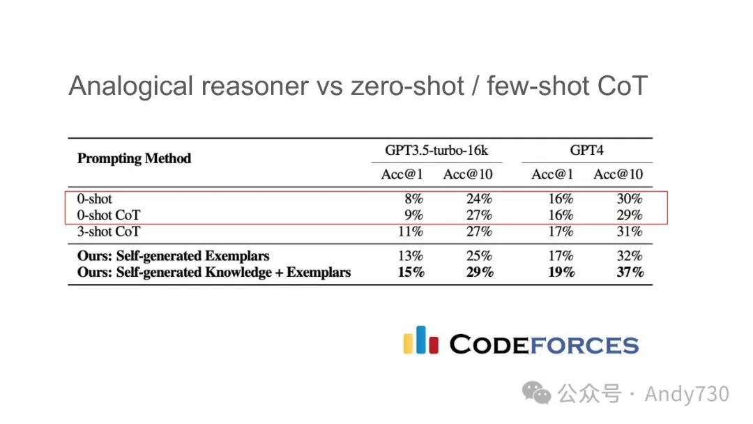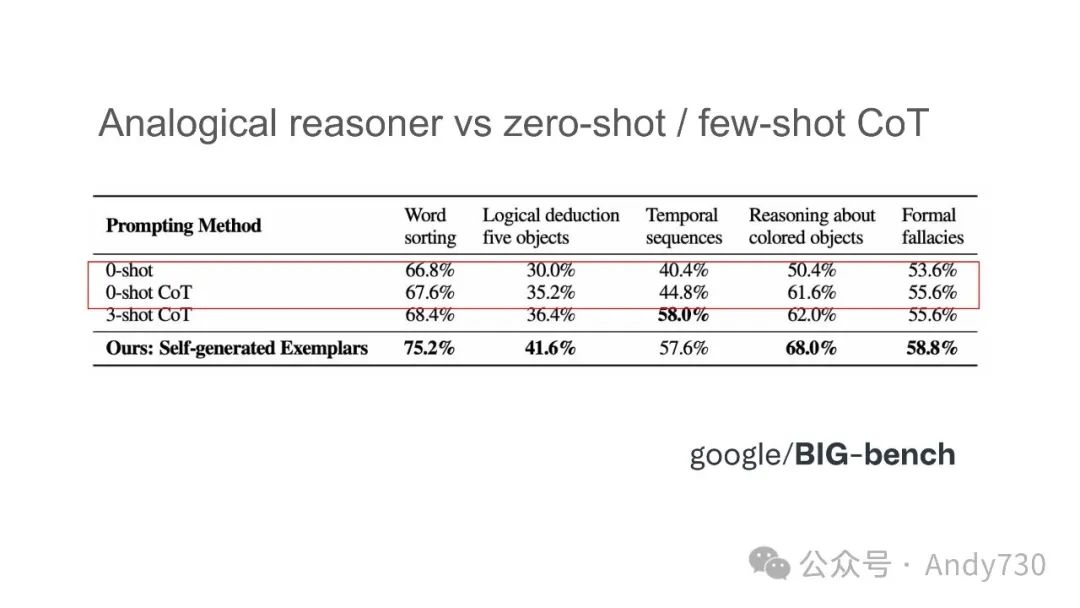 我们发现,实际上,我们通过基准测试验证了效果,结果非常好。你可以看到最后一行是通过提示生成的类比推理器。当然,你可以自己优化这些提示,以获得更好的结果。