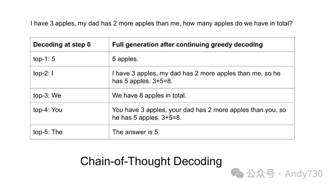 让我们看一个例子:“我有3个苹果。我爸爸比我多2个苹果。我们一共有多少个苹果?”对于这个例子,方法很简单。在解码过程中,我们考虑所有可能的token。