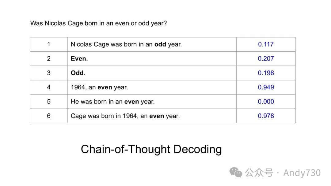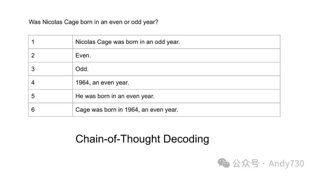 另一个例子是:“尼古拉斯·凯奇是出生在偶数年还是奇数年?”第一次回答是“尼古拉斯·凯奇出生在奇数年。”那个“尼古拉斯”是第一个token。第二个回答说“偶数”,后面跟着句号,第三个是“奇数”,同样跟着句号。现在,我可能会说,如果尼古拉斯·凯奇知道的话,模型在回答中可以利用链式思维。