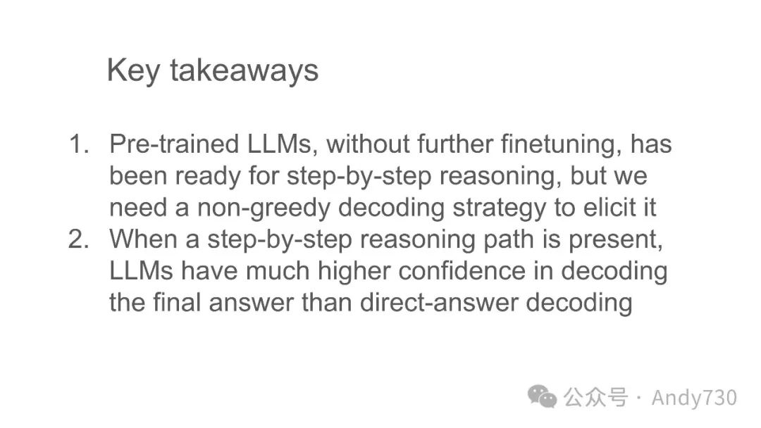 关键观察:预训练的大型语言模型在从前k个token开始的生成中显示出逐步推理的响应。在这里我们不需要使用任何提示。在逐步推理路径上,解码最终答案的置信度更高。