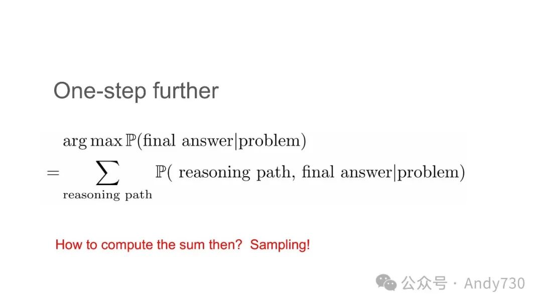 现在,让我们进一步探讨。给定问题的最终答案的概率——我们如何计算?我们应该对所有可能的推理路径进行求和。因此,总概率是根据我们所学得出的。对于一个数学问题,你可以找到不同的解决方案,这些解决方案在求和时会导致相同的答案。