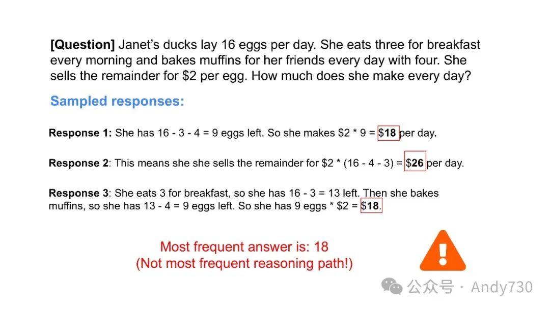 让我们看这个问题:给定一个数学问题,我们可以多次采样答案。最后,你会说出现次数最多的答案是18。然而,我要在这里警告:这并不是推理路径中出现次数最多的答案。它会选择出现次数最多的答案吗?这有着显著的区别。这里的推理路径是一个潜在变量。
