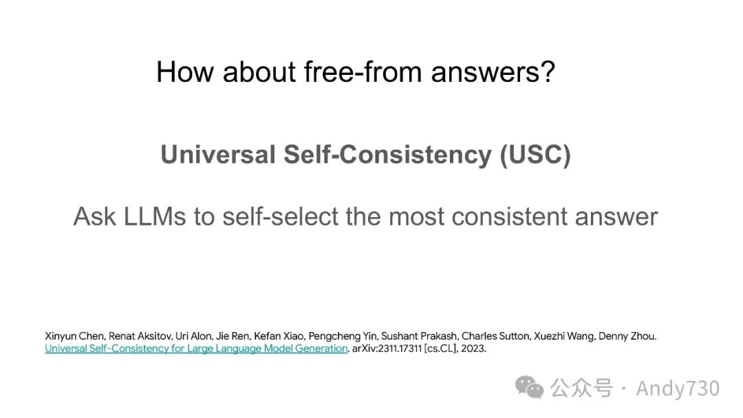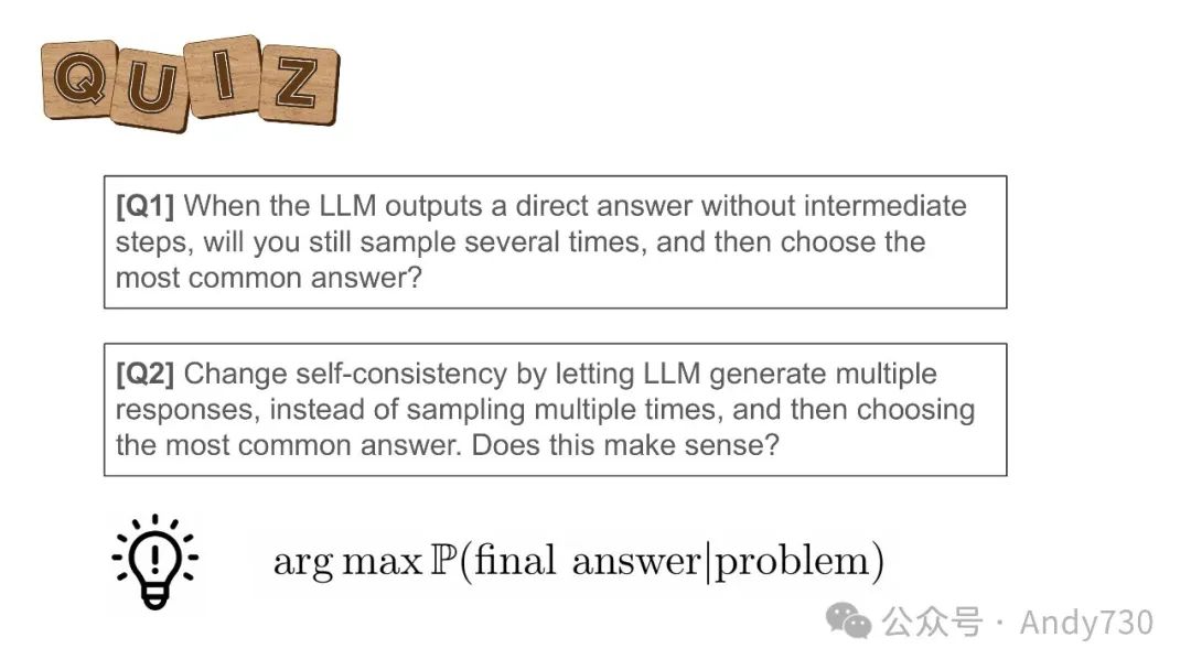 第二个问题,通过让大型语言模型生成多个响应而不是采样,然后选择最常见的答案,是否有意义?答案是否定的。对于这两个答案,我们只需要遵循这个原则:给定问题,最终答案的概率的最大值。这就是你需要理解的自一致性。这是一个非常简单的原则,也是机器学习中的基本原则之一。如果我们对机器学习了解得更好,我们会将其视为最大边际推理(Inference)。
