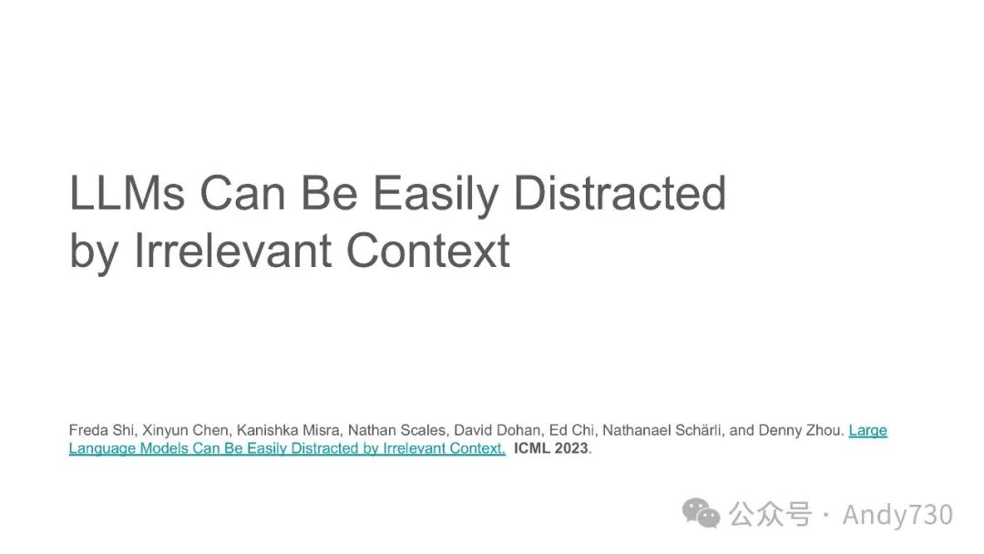 接下来,我要谈论局限性。我想讨论的第一个局限性是“大型语言模型容易受到无关上下文的干扰。”