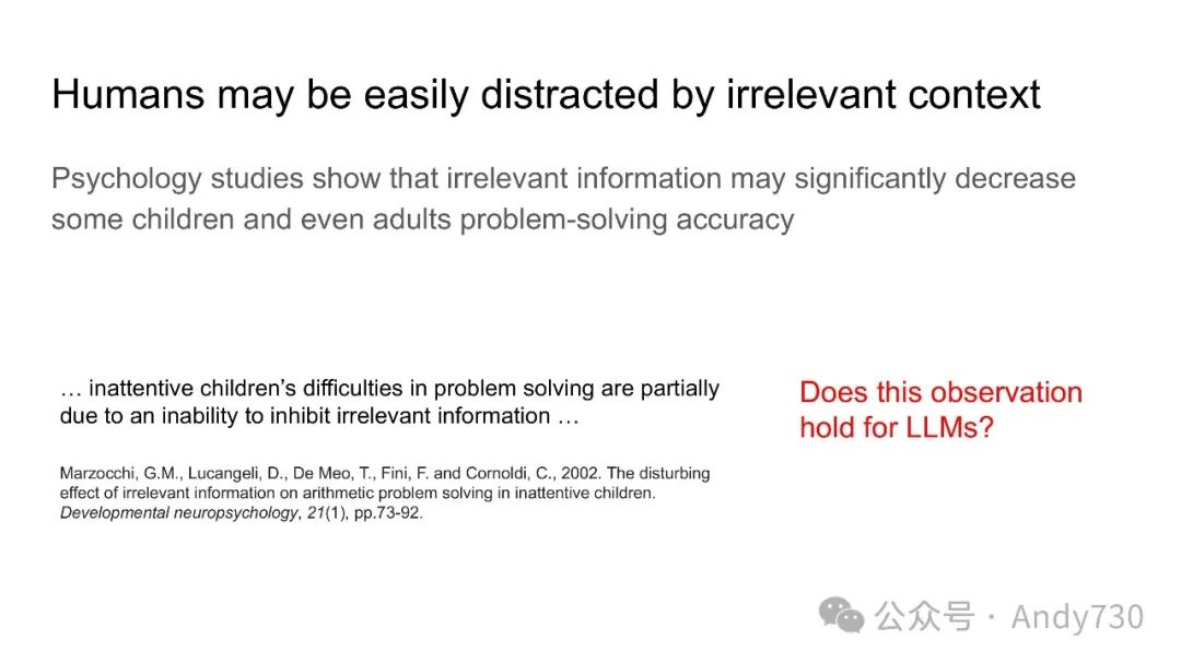 心理学研究表明,无关信息可以显著降低儿童和成人的问题解决准确性。我想检查这一观察是否适用于大型语言模型。