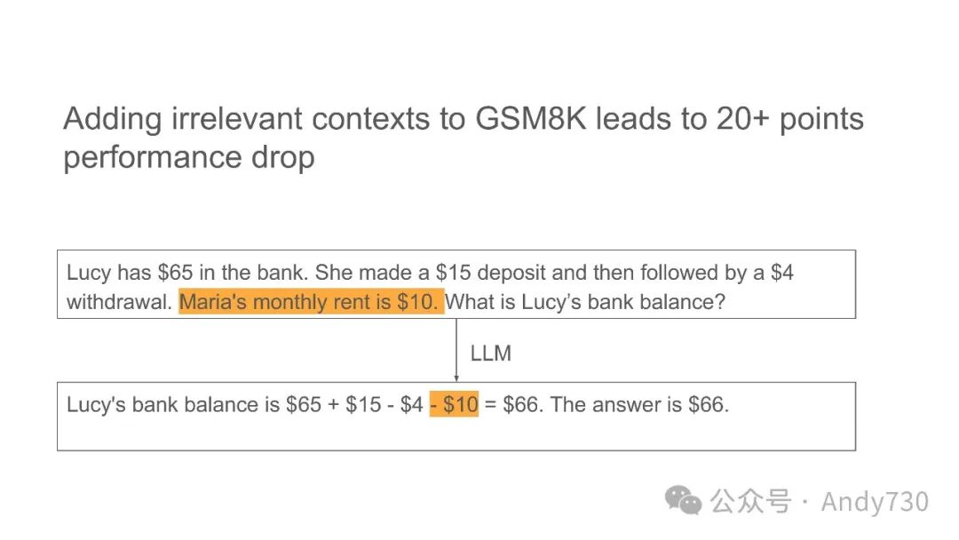 这些都是简单的问题。突出文本“玛利亚的月租是10美元”与原问题无关。你可以看到,之后模型产生了错误的解决方案。