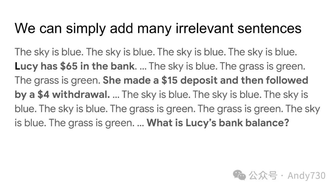 然而,如果我们使无关上下文任意增大,恢复仍然具有挑战性。例如,我们可以添加无关句子,比如“天空是蓝色的,草是绿色的。”你可以让这个输入任意长,你会观察到所有大型语言模型的性能都有显著下降。