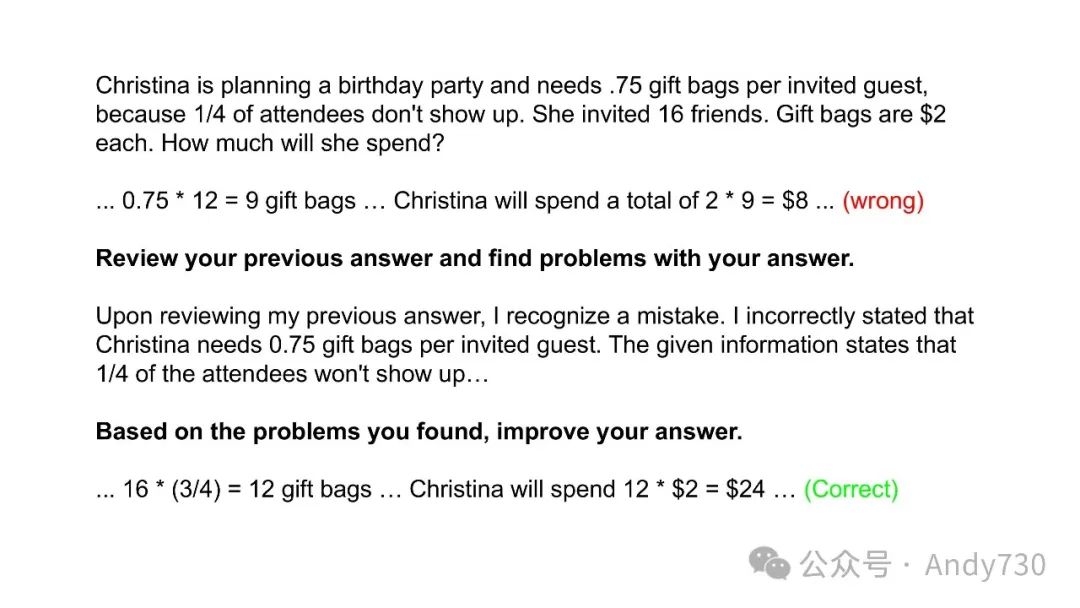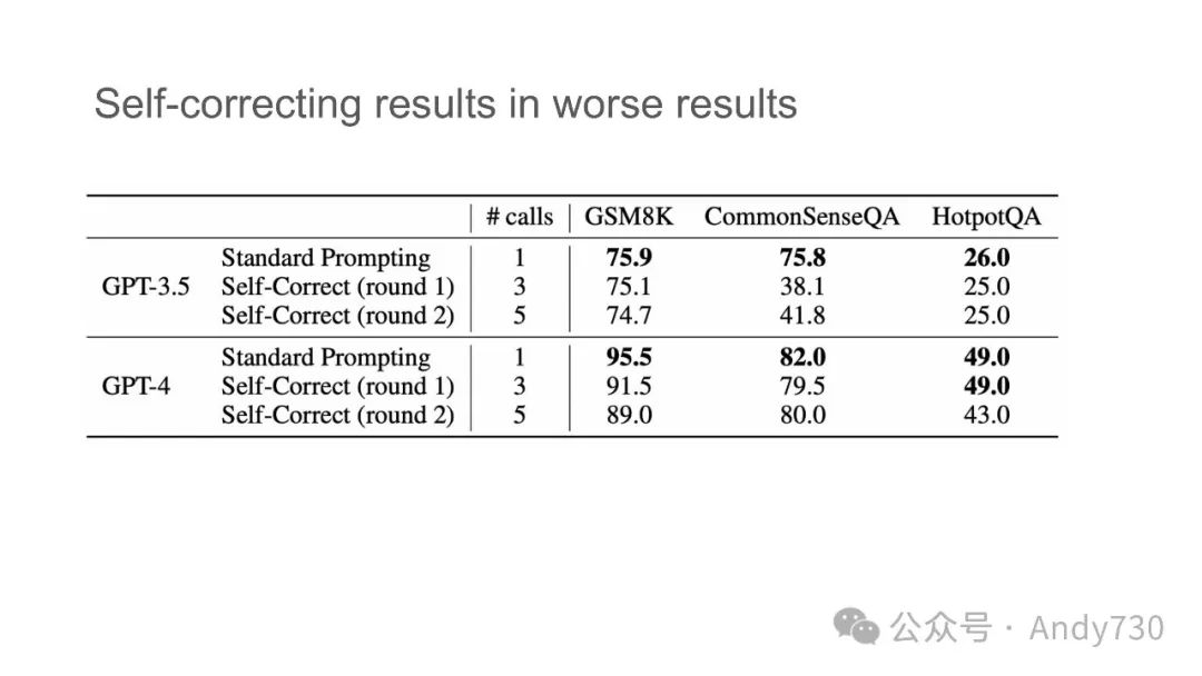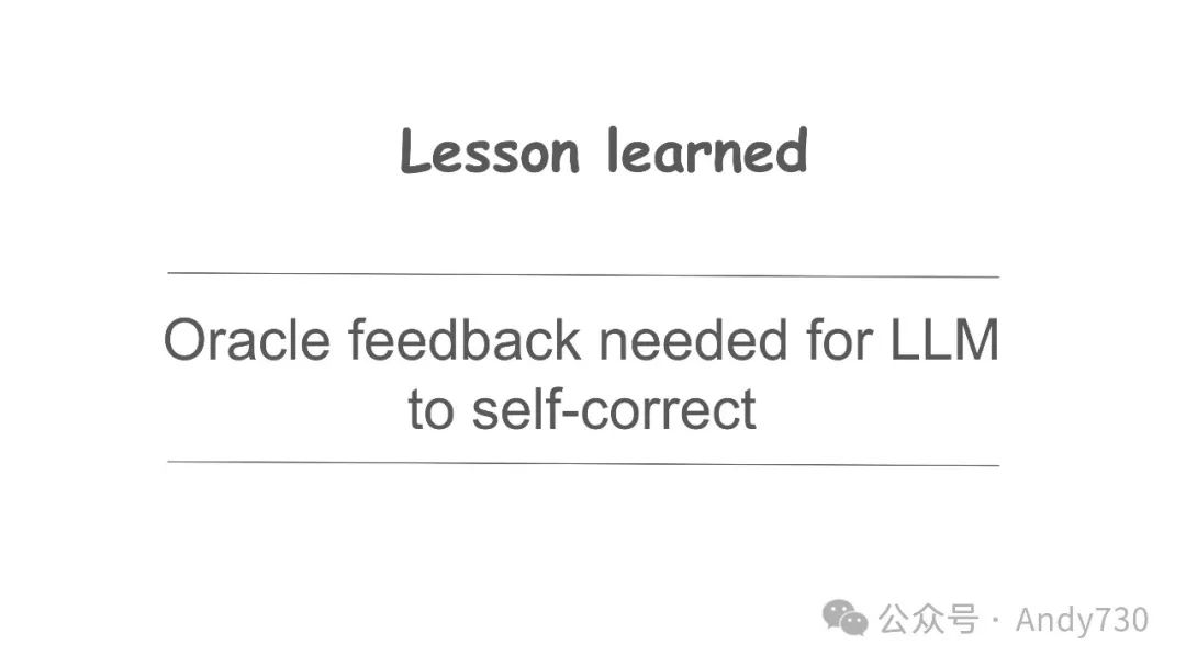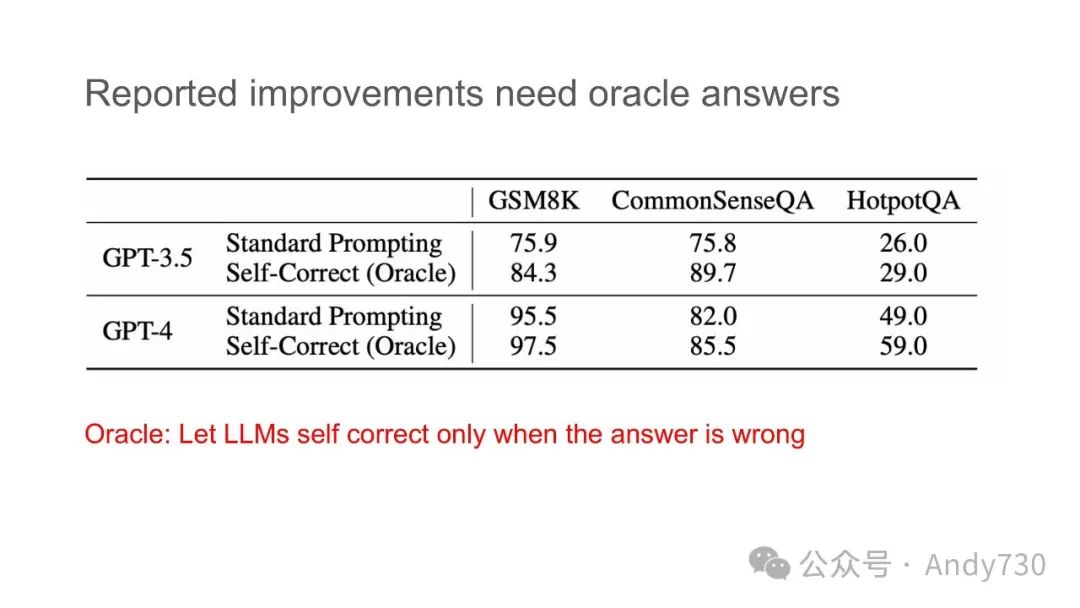 你可能见过一些文献中的改进声明,声称这些改进源于推理(Reasoning)。然而,它们通常使用的是oracle答案。oracle意味着你只在答案错误时提示大型语言模型进行纠正。问题在于模型并不知道答案是正确还是错误。你告诉它,“好的,答案是错误的。请纠正。”