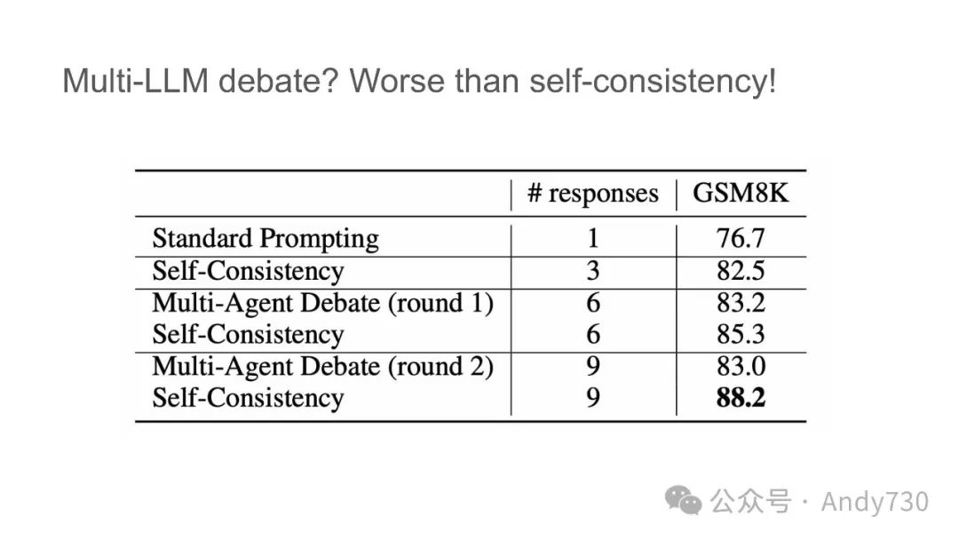 此外,还可以让多个大型语言模型互相辩论,直到达成一致或共识。我们也尝试了这种方法,但发现关键在于生成多少响应。例如,如果我们有三个大型语言模型,但并非所有模型都生成响应,那就是三个响应。如果让它们辩论,那么就会有九个响应。