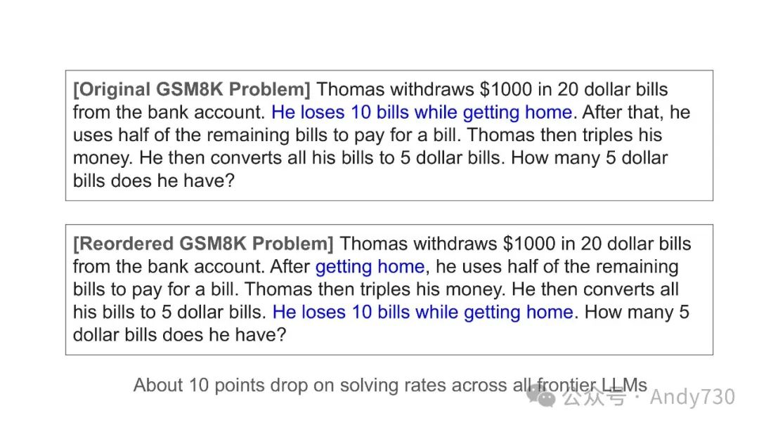 我团队的任务之一是生成不同的评估任务以测试模型。在这里,我们进行了一个简单的实验。我们获取了一个原始的GSM8K问题,稍微重新排列了一下句子,然后观察模型是否仍能解决该问题。在原始问题中,主体在回家时丢失了10美元的纸币。我们将这句话移到最后,并记录发生了什么。我们调整了一些GSM8K问题,发现所有前沿大型语言模型的解题率下降了大约10个百分点。