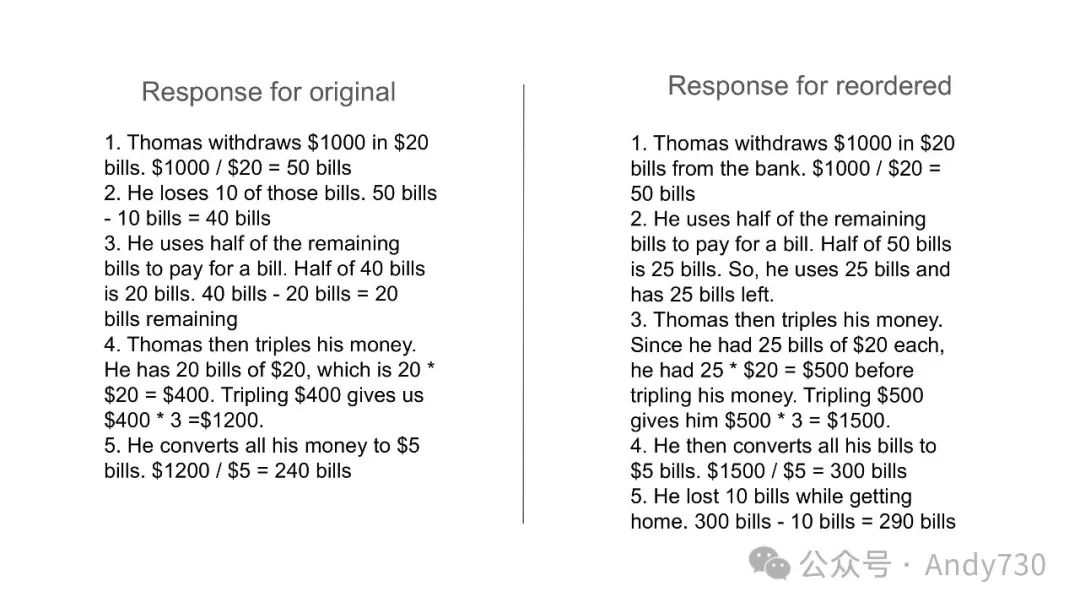 这里是响应结果。你可以比较原始问题和重新排序的问题。模型基本上知道如何顺序解决问题,但无法前后跳转。