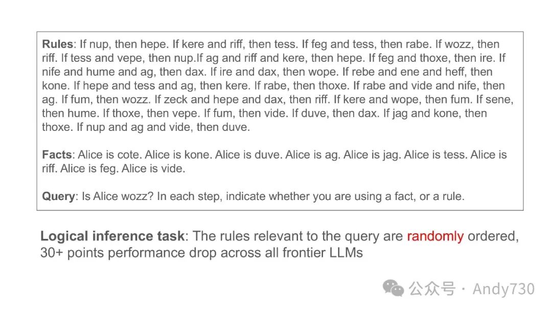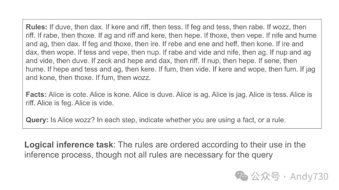 有人可能会认为这与某种语义理解有关,而不仅仅是推理(Reasoning)。接着,我们设计了另一个任务,称为逻辑推理(logical inference),这比数学问题更加纯粹。即使我们不使用真实的词语,也在这里利用随机token。给定规则和事实,模型的任务是针对查询提供推理。原始问题的规则按照推理过程中的使用顺序排列。然而,并非所有规则对某个查询都是必要的。