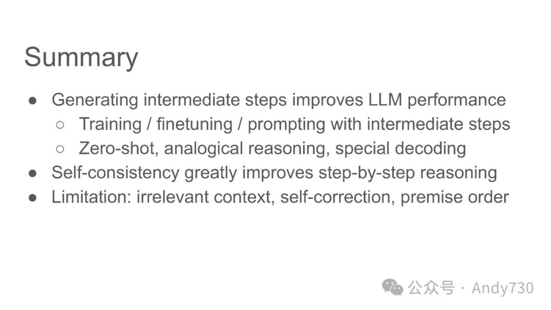 现在让我总结一下演讲内容。首先,我想强调生成中间步骤显著提高了大型语言模型的性能。你可以通过训练、微调或使用中间步骤进行提示,也可以应用零样本类比推理(Reasoning)或特殊解码技术,例如我今天展示的17种解码方式。此外,自一致性在逐步推理(Reasoning)中也大大增强,无论是来自微调模型还是微调本身。