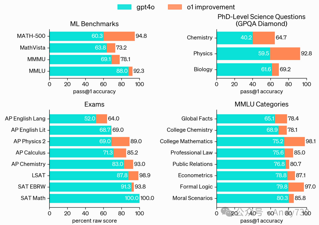 o1在多个基准测试上优于GPT-4o,包括MMLU的54/57个子类别。图中展示了七个类别作为示例。